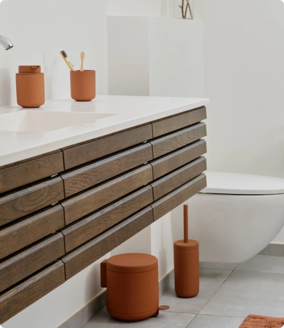 TerracottaEarthy, warm red-brown toneTiles, floors, cabinetryBathroom sinks, towel racks