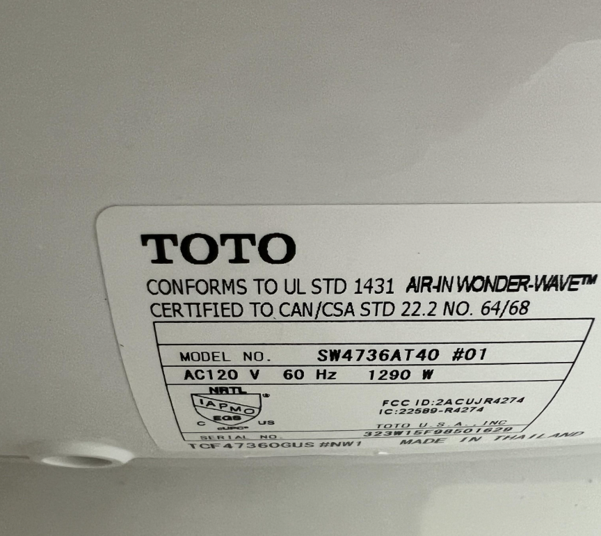 Heated seat and dryer | UL, ETL (US/CA), CE (EU), PSE (Japan) |